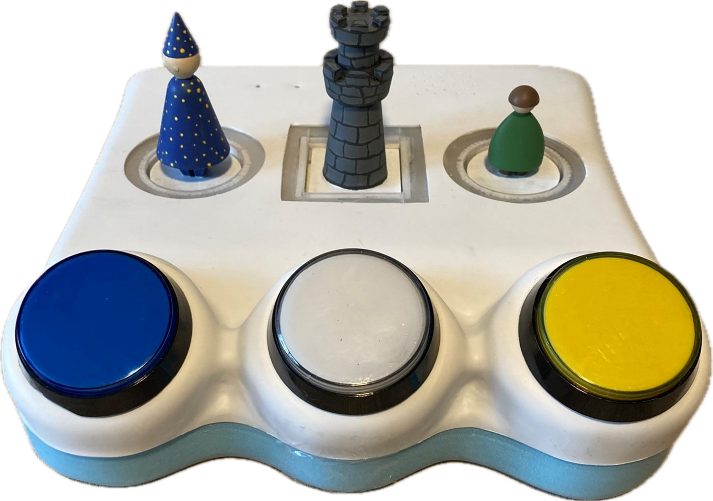 The narrator takes the lead: constructing the narrative, introducing audio-visual effects, and posing multiple-choice questions. The child responds by pressing one of three color-coded buttons on the board, influencing the story's direction.